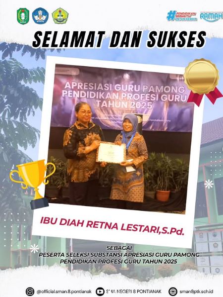 Selamat kepada Ibu Diah Retna Lestari,S.Pd. telah terpilih untuk mengikuti Kegiatan Apresiasi Guru Pamong PPG 2025.